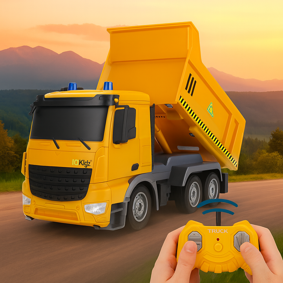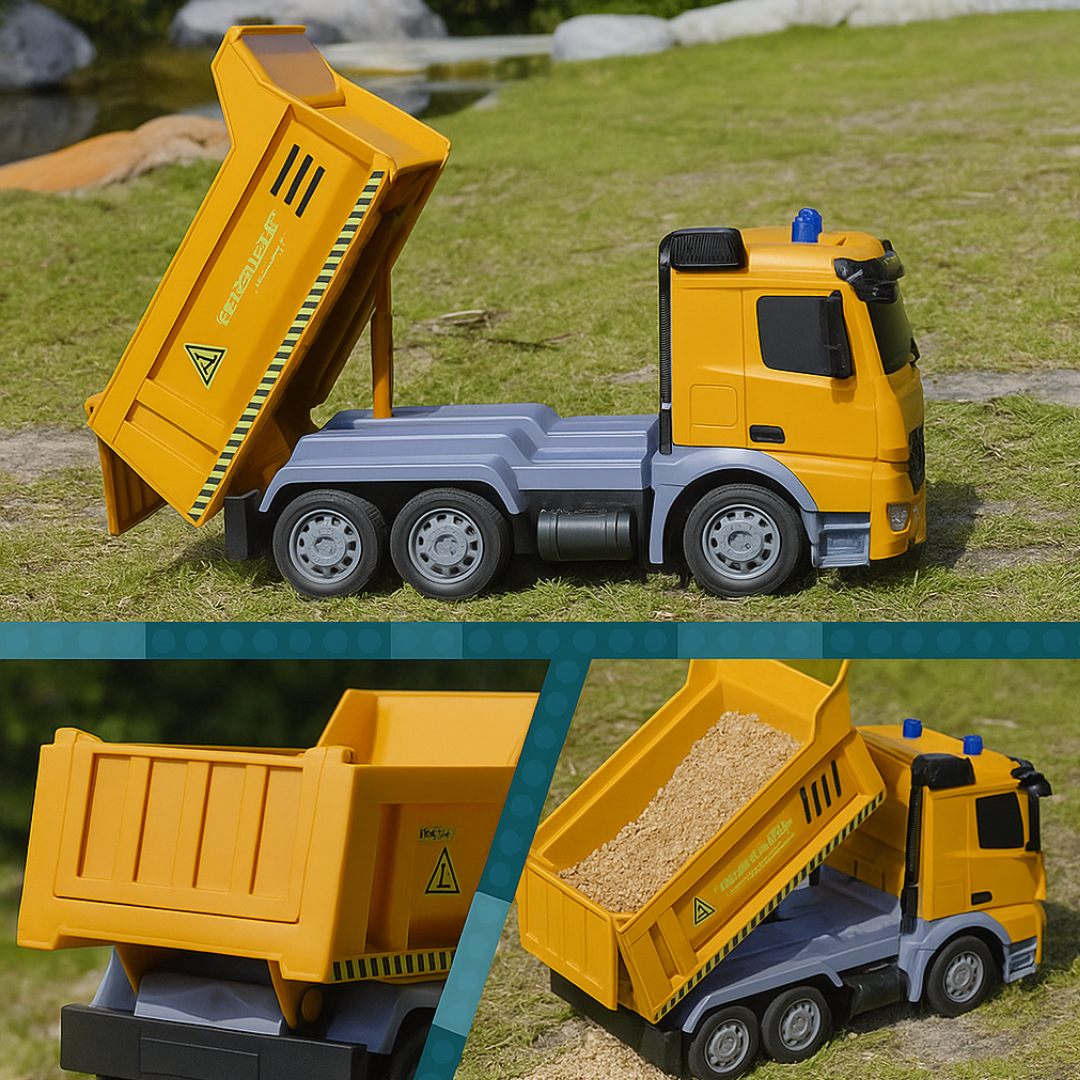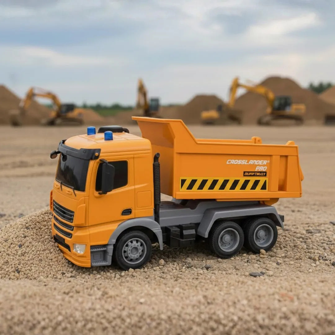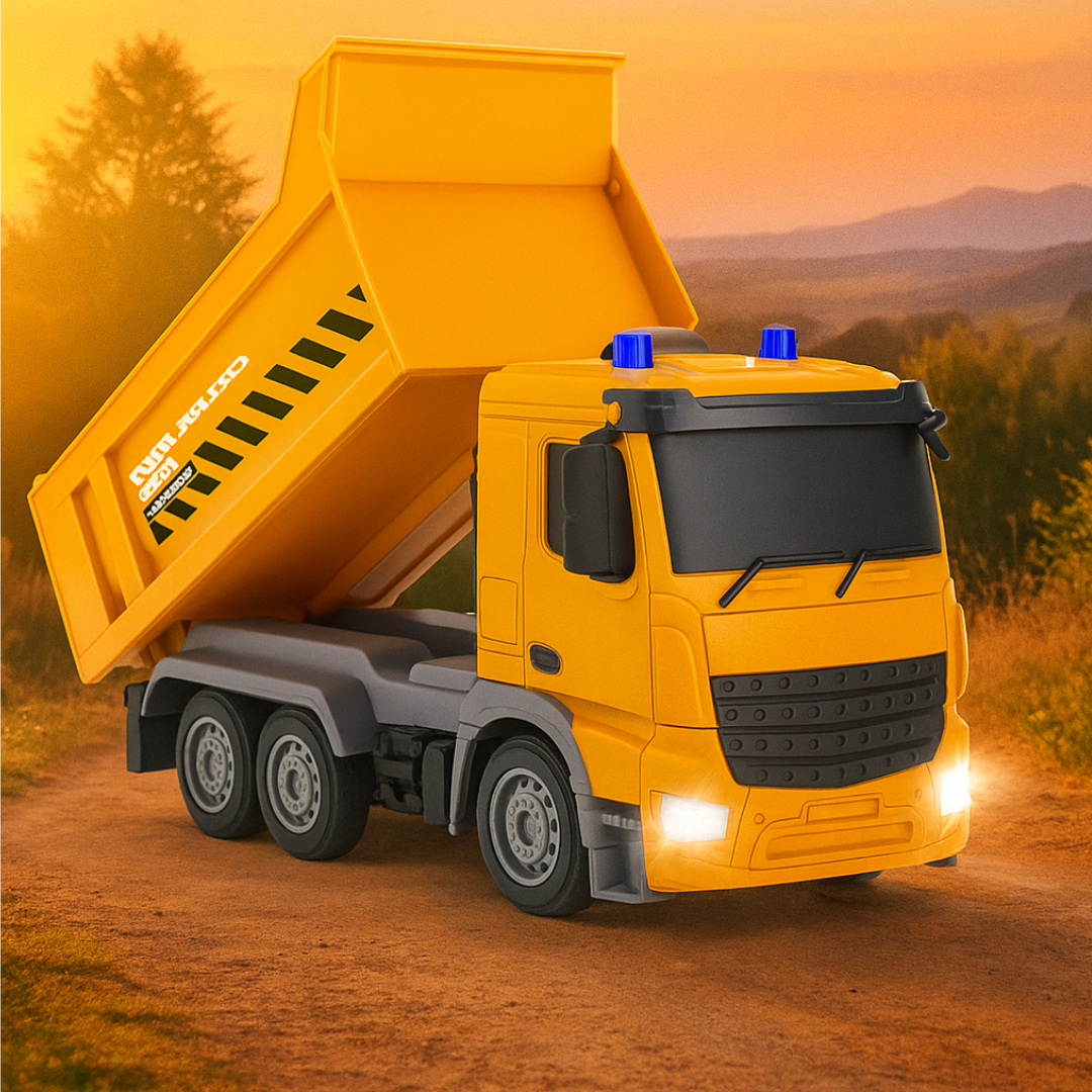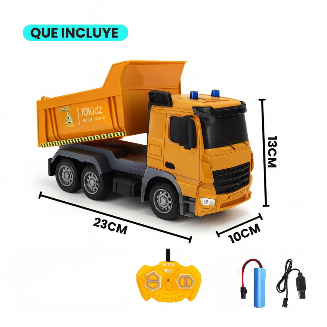 ¡Un camión de verdad en miniatura! Con control remoto, luces y volquete funcional. 👷