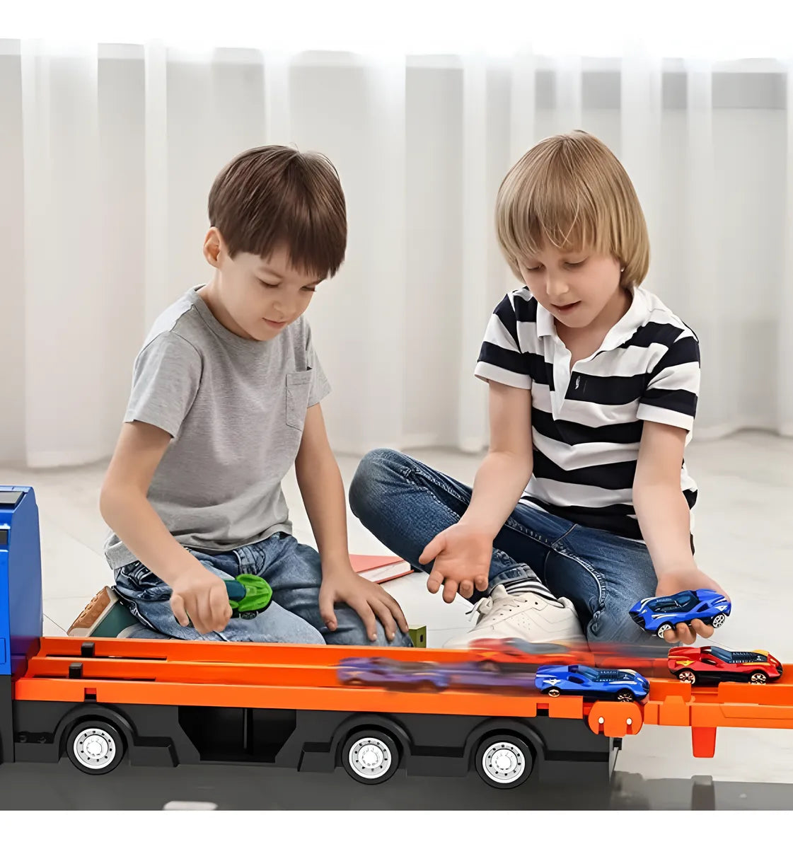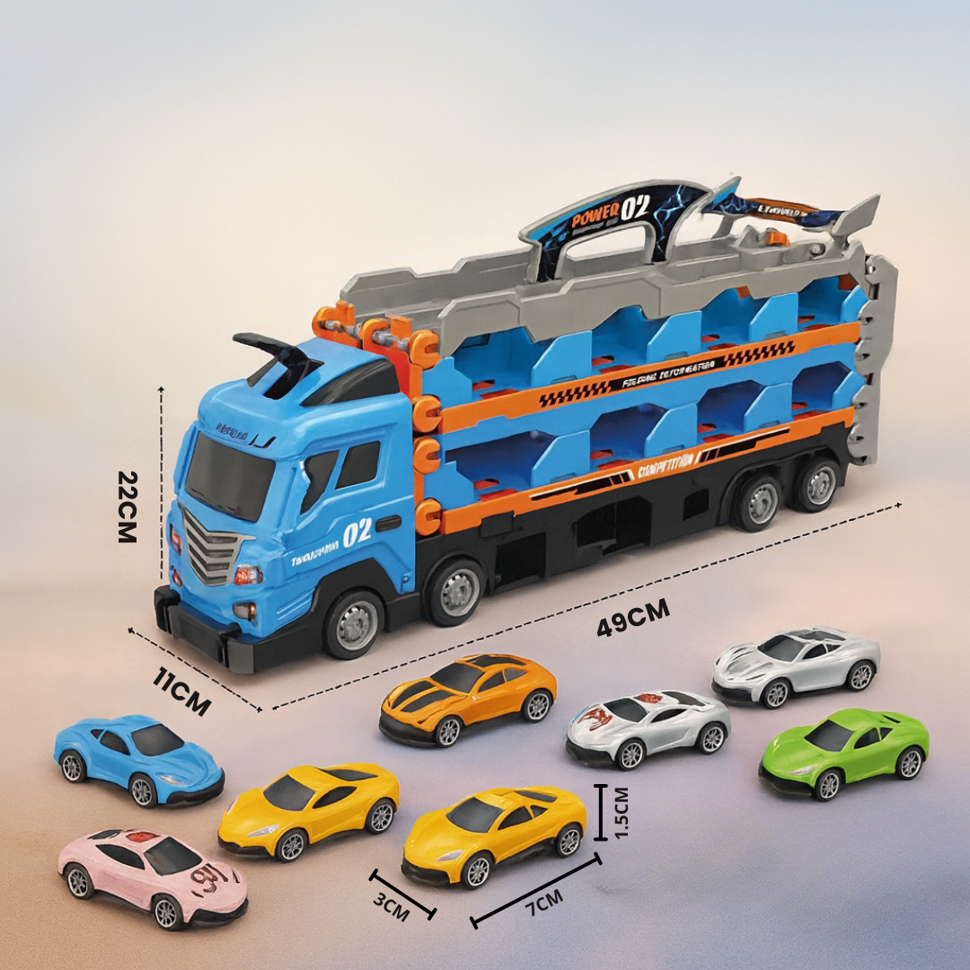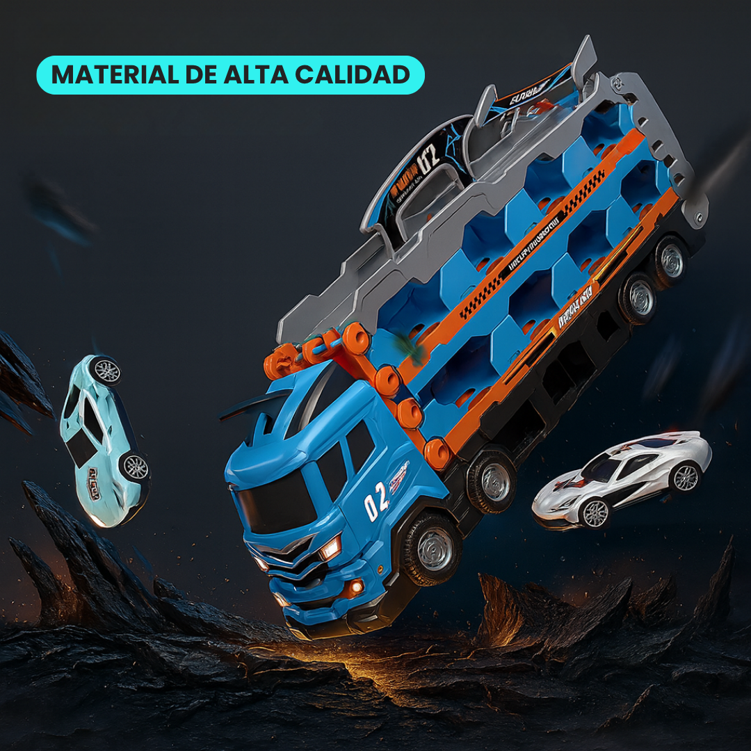 No es solo un camión porta autos, ¡se despliega y se transforma en una pista de 2.1 metros! Perfecto para espacios reducidos y para llevar la diversión a cualquier lado.
