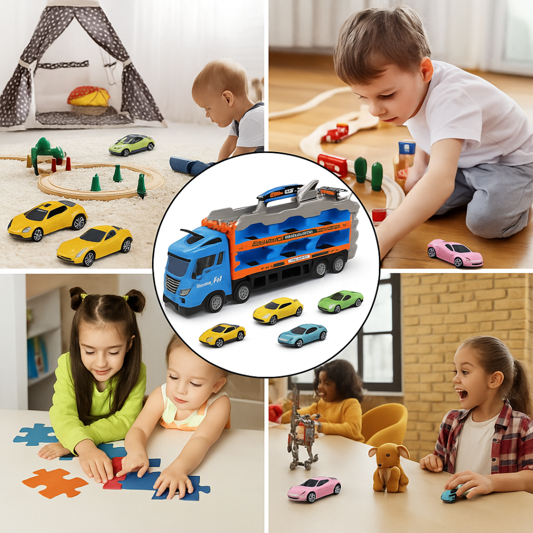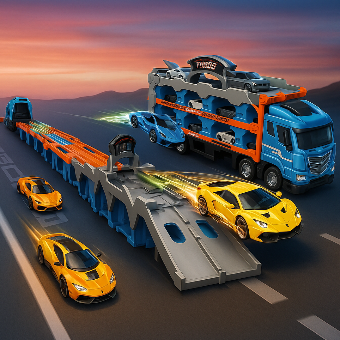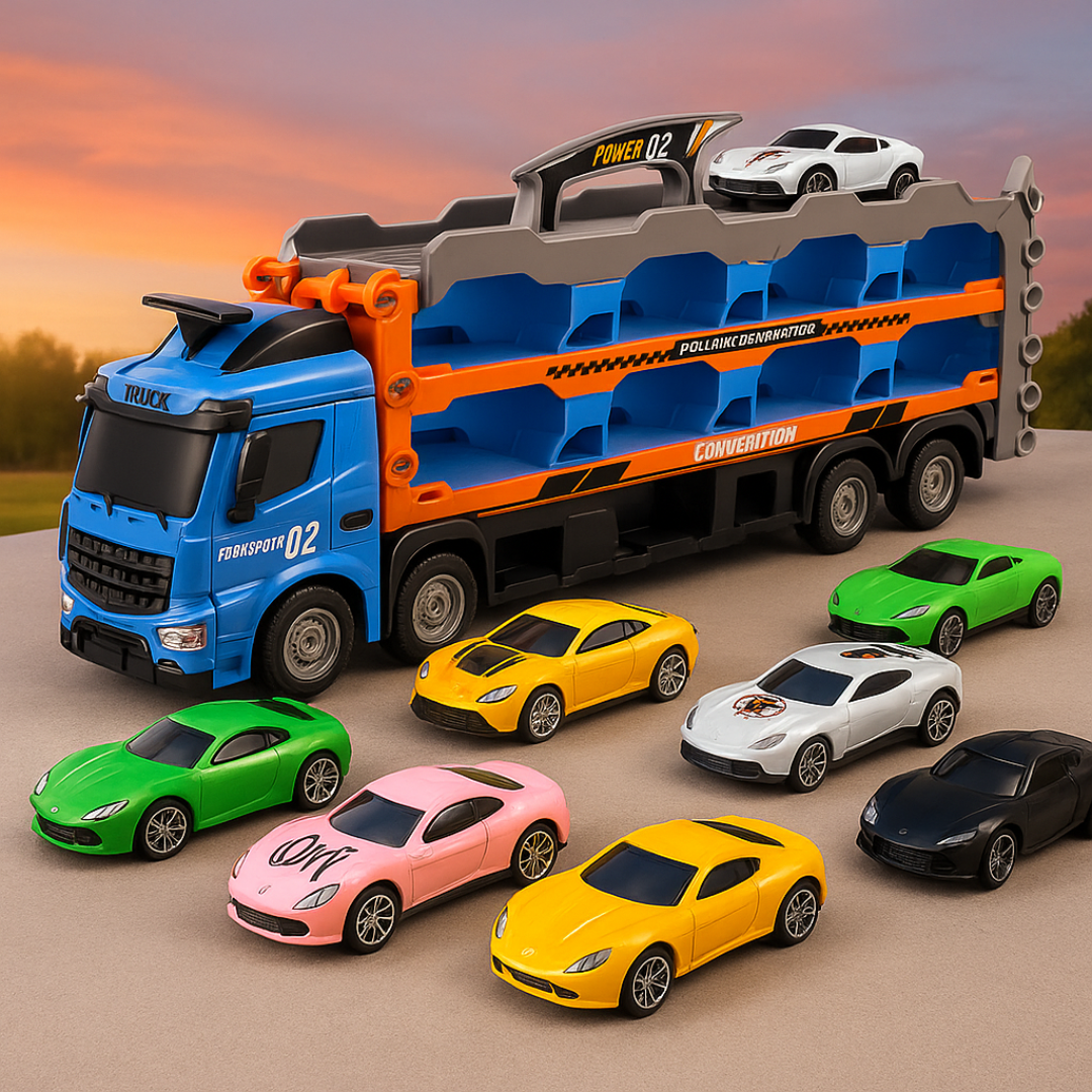 No es solo un camión porta autos, ¡se despliega y se transforma en una pista de 2.1 metros! Perfecto para espacios reducidos y para llevar la diversión a cualquier lado.
