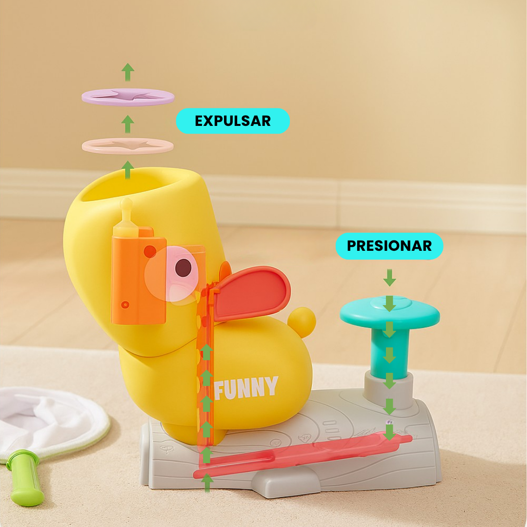 🚀 ¡Pisa, lanza y atrapá! Este pato lanzador hace que los discos salgan disparados hacia el cielo.