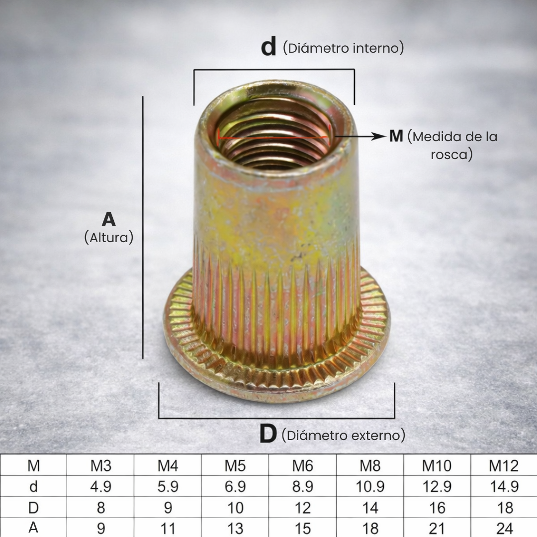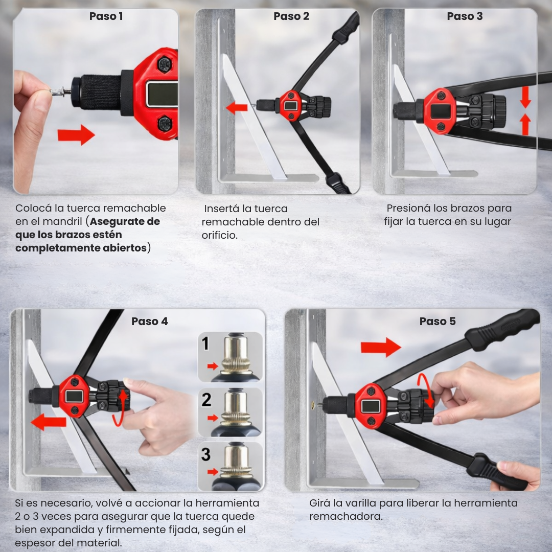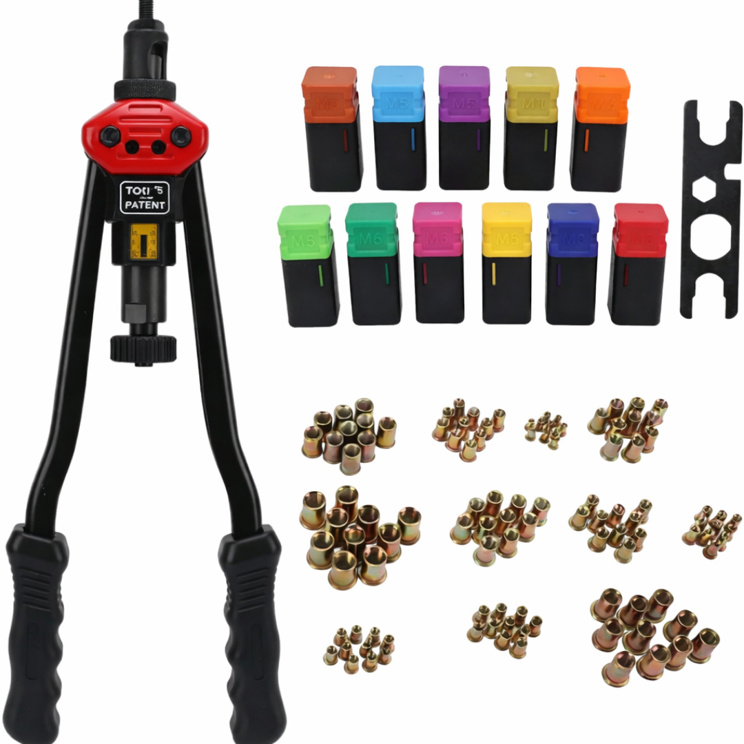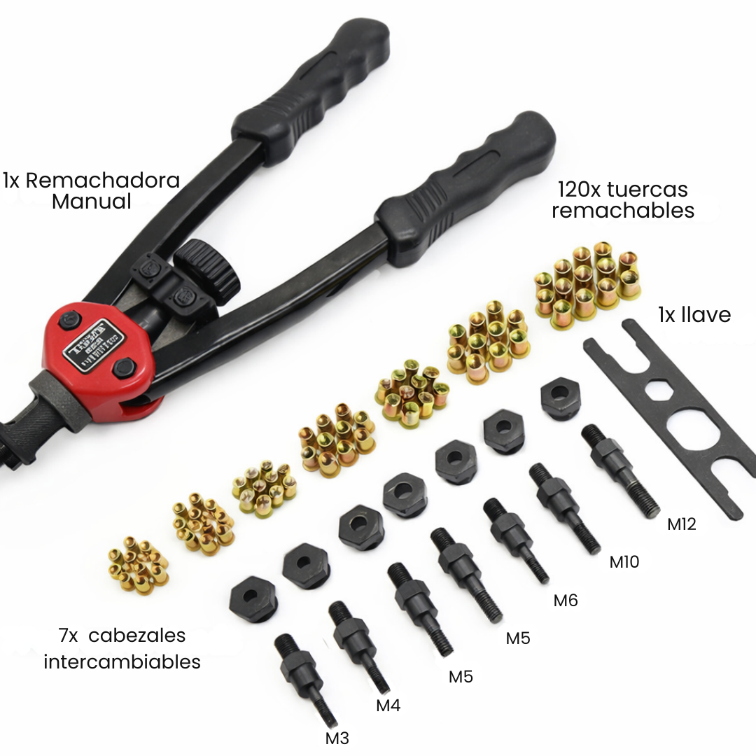 El sistema de cabezal de cambio rápido sin herramientas te deja pasar de M3 a M12 en segundos, acelerando cada trabajo. El set incluye cabezas M3/M4/M5/M6/M8/M10/M12 y un surtido completo de remaches, todo ordenado en una caja plástica resistente.