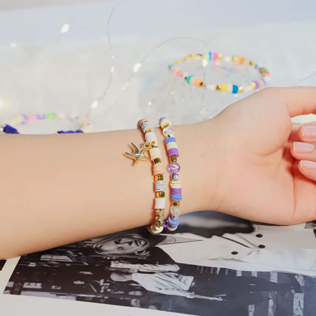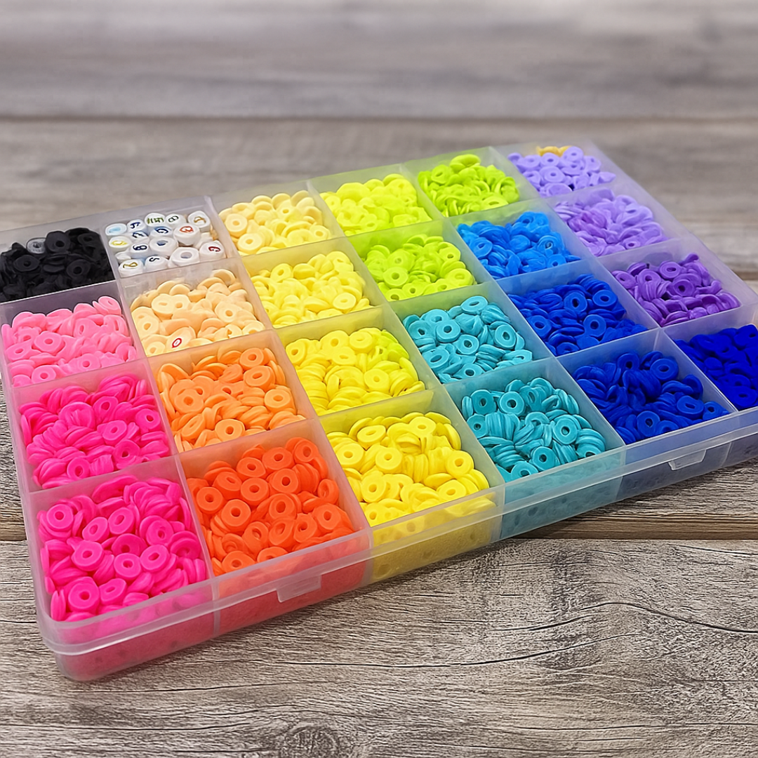El set incluye 24 colores brillantes de cuentas heishi de arcilla polimérica, perfectas para armar estilos veraniegos, boho, minimalistas o súper coloridos.