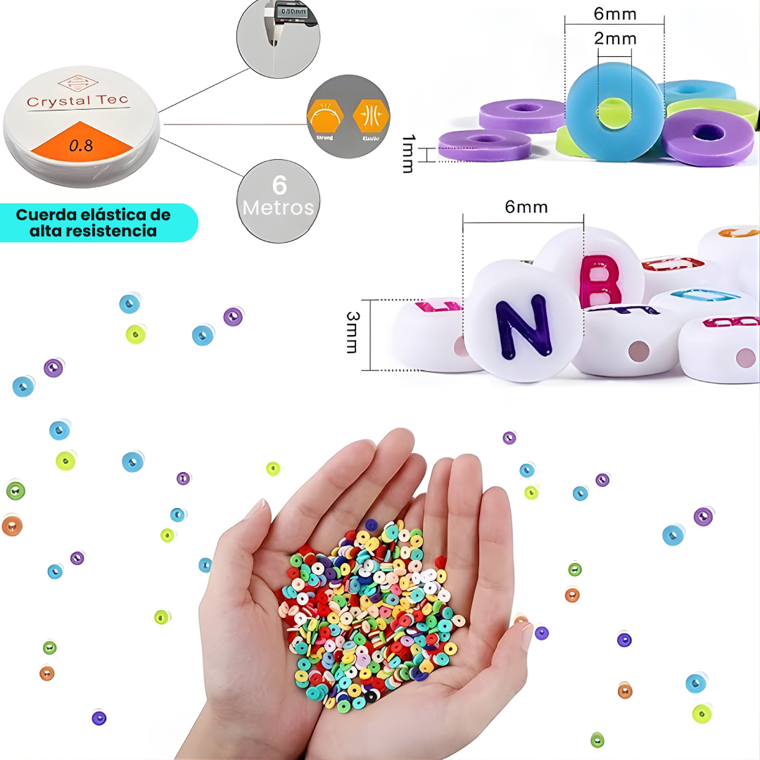 Viene con más de 7000 cuentas, dijes, letras, hilos elásticos y herramientas para hacer accesorios únicos sin necesitar experiencia previa.